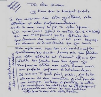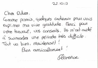“Bonsoir Didier ! Vraiment très impressionnée par la rapidité de votre envoi (mon courrier était inutile !!!) J’apprécie votre sérieux et votre professionnalisme !!!Vous êtes vraiment (en plus) un homme de coeur ! (je vous rassure je ne suis pas voyante ou autre chose !) Encore merci Didier pour tout ce que vous faites !” Mme Flora O