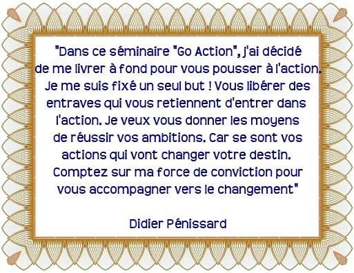“Bonjour Didier, j’ai bien visionner toutes les vidéos et je dois dire que le programme Go Action est plein de bon sens. Les enseignements sont simples, clairs et faciles d’applications dans la vie de tous les jours . Maintenant que l’on connait le cheminement, il est facile de comprendre les choses et de se mettre au travail !!! Merci pour tous vos conseils, Cordialement “Mona