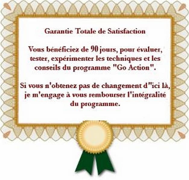P.S : Je m’engage formellement auprès de vous ! Celui que dans 90 jours, si vous mettez en pratique les conseils que je vous indique dans ce programme “Go Action”, votre vie sera complètement, radicalement changée pour le mieux.